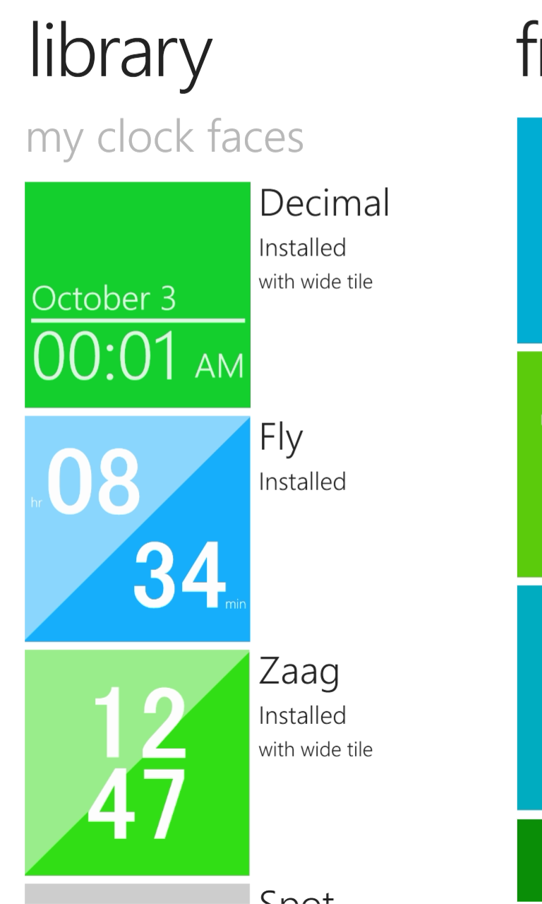 Giao diện của Live Tile Clock 8.1 khá đơn giản với 3 tab. Tab đầu tiên là thư viện chứa các mặt đồng hồ mà bạn đã chọn.