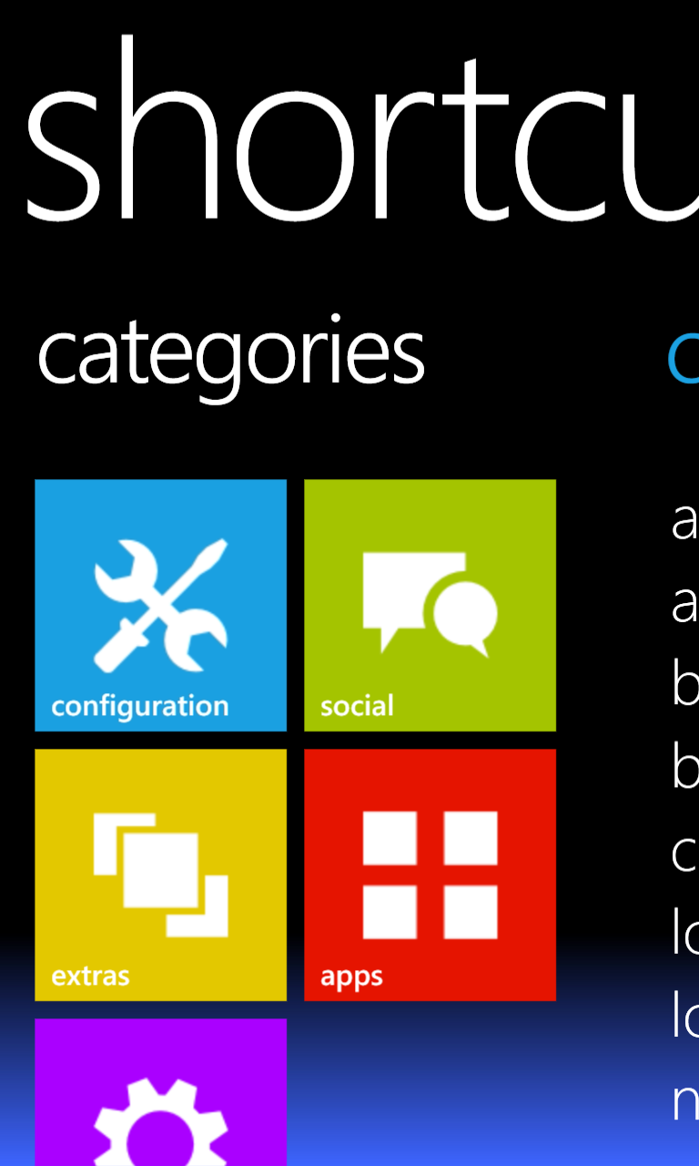 Ở tab đầu tiên của ứng dụng, bạn có thể thấy các nhóm chủ đề để tạo như: configuration chứa các lối tắt tới các thiết lập như bật tắt dữ liệu di động, vị trí, bluetooth, khóa xoay màn hình…; social chứa các lối tắt tạo tin nhắn, liên lạc trong danh bạ nhanh,…; mục extras bao gồm các lối tắt như đèn pin, tạo ghi chú,…; mục apps có các lối tắt tới các ứng dụng phổ biến trên Windows Phone như Facebook, Twitter, camera, HERE Maps,…