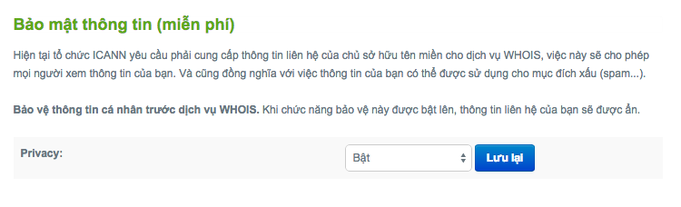Mặc định, thông tin whois như Tên, Địa chỉ liên hệ, địa chỉ email.v.v của chủ sở hữu tên miền sẽ được công khai trên các hệ thống Whois. Privacy protection là tính năng giúp bạn ẩn thông tin Whois mình, giúp bảo mật tên miền và ngăn chặn spam.