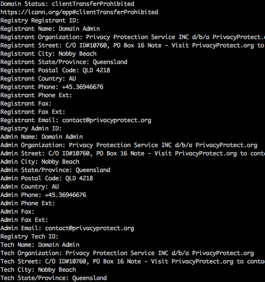 Kết quả whois sau khi đã bật Privacy Protection (bảo mật thông tin)