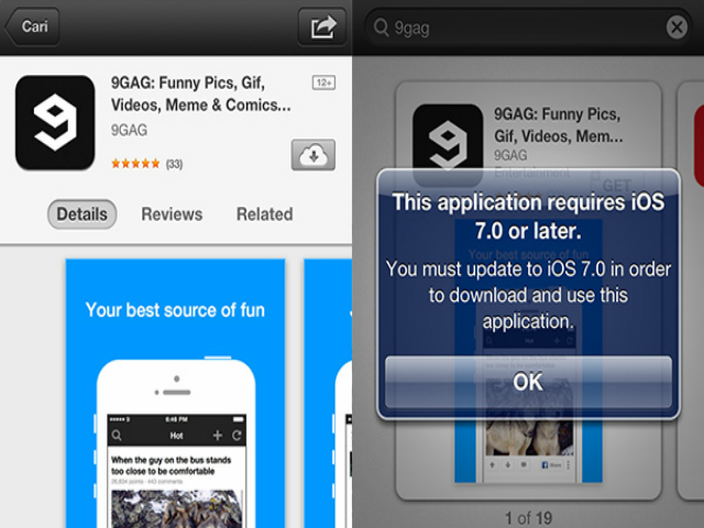 Phiên bản iOS 8 cho các thiết bị Apple ra đời mang theo nhiều cải tiến và tính năng mới như Continuity, Apple Pay và SMS Relay. Tuy nhiên, nhiều tính năng trong số đó sẽ không hoạt động trên các thiết cũ như iPhone 4, đồng thời một số ứng dụng còn yêu cầu nâng cấp thiết bị lên tối thiểu iOS 7 để có thể chạy tốt hơn. Dấu hiệu nhận biết trường hợp này là máy sẽ hiển thị thông báo như hình sau.