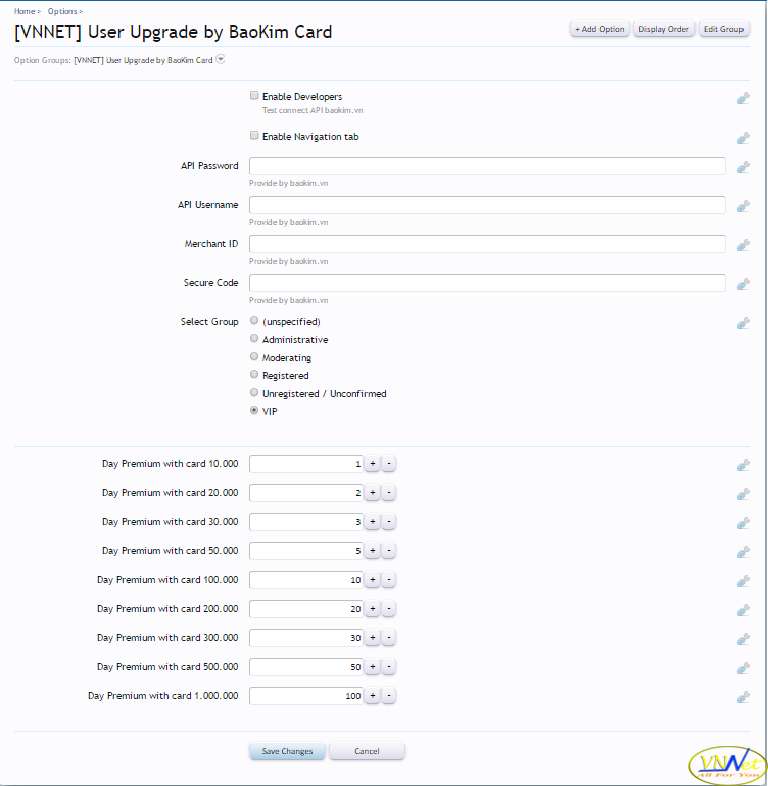 - Vào Admim.php -> Option -> [VNNET] User Upgrade by BaoKim Card config đầy đủ thông tin trong mục option là ok.