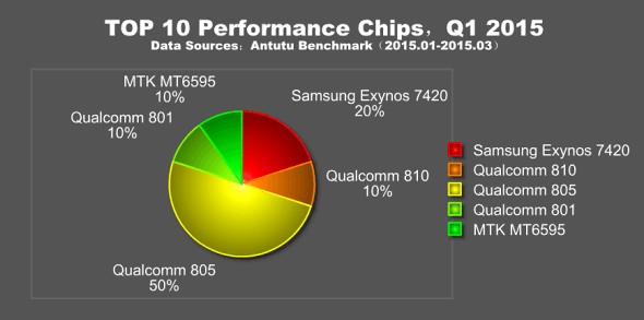 Trong danh sách này, 2 thiết bị dẫn đầu là Galaxy S6 và Galaxy S6 Edge chạy chip Exynos 7420. Đứng thứ 3 làHTC One M9 với vi xử lý Snapdragon 810. Một điều thú vị là mặc dù có cùng cấu hình sức mạnh nhưng Galaxy S6 Edge lại có điểm số thấp hơn so với S6. Đứng thứ 4 là Galaxy S5 chạy chip Snapdragon 805, thêm một niềm vui cho Samsung.
